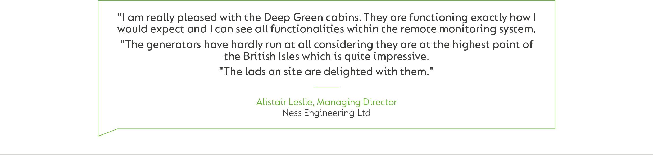Comparing the Deep Green units to standard ‘eco’ welfare cabins (with 12V lighting and USB charging) with an estimated average generator run time of 4 hours per day, Ness have saved at least 1631 litres of fuel and avoided 4177kg of CO2 emissions (Scope 1) during the 53 day period. If you use a CO2 calculation that includes the Scope 3 emissions from the production of the diesel production process then this CO2 saving rises to 5154kg.