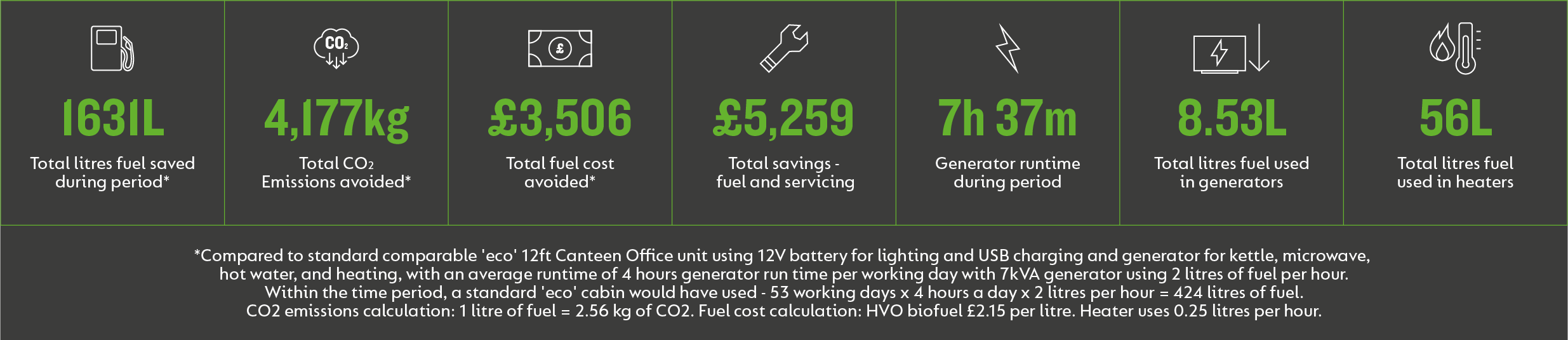 Comparing the Deep Green units to standard ‘eco’ welfare cabins (with 12V lighting and USB charging) with an estimated average generator run time of 4 hours per day, Ness have saved at least 1631 litres of fuel and avoided 4177kg of CO2 emissions (Scope 1) during the 53 day period. If you use a CO2 calculation that includes the Scope 3 emissions from the production of the diesel production process then this CO2 saving rises to 5154kg.